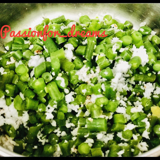 3. Take a bowl and add par boiled beans, fresh grated coconut, zest, salt, sugar, coriander, green chilli paste and mix together but make sure the dal is not smashed.